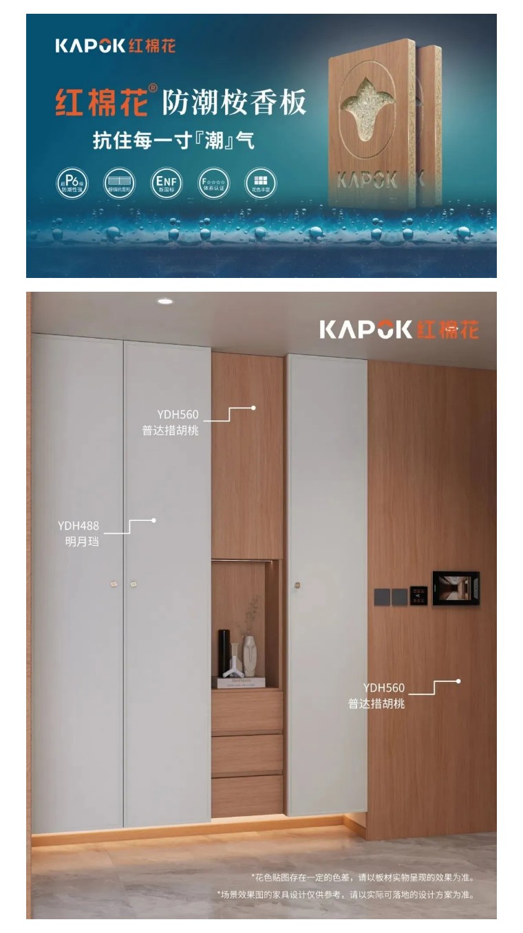 例如,双方联合打造的红棉花防潮桉香板堪称行业标杆:精选优质大径桉木基材,通过独特的刨花颗粒纵横交错架构工艺,确保板材实现 “一门到顶不变形”;同时采用医用级 MDI 生态胶替代传统胶水,甲醛释放量≤0.025mg/m³(国标ENF级)。红棉花防潮桉香板在衣柜、橱柜等潮湿场景及母婴接触场景中,兼具安全与耐用性。