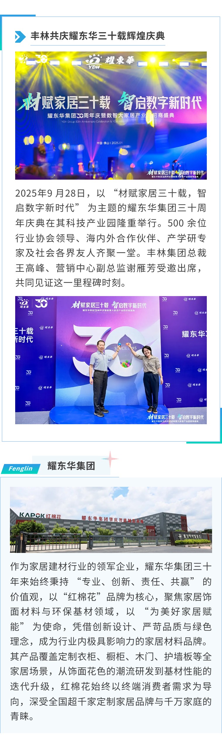 三十而立,再赴新程。值此耀东华三十周年庆典之际,丰林集团衷心祝愿耀东华及红棉花品牌未来再创辉煌,在材料创新与智能制造的道路上越走越远!